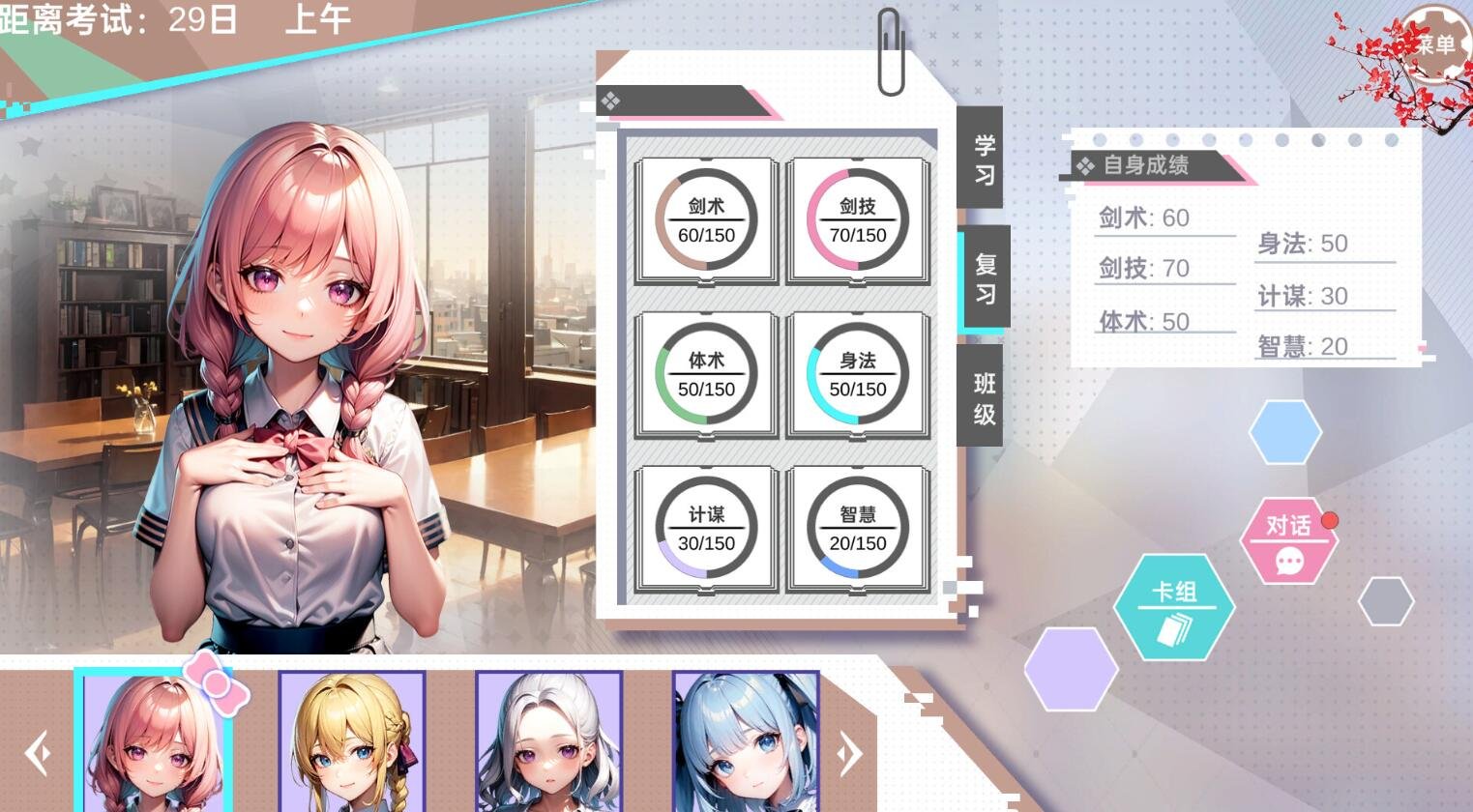 通过学习复习来培养属性,与9名女性进行卡牌对战、收集卡牌、培养羁绊,解锁剧情,