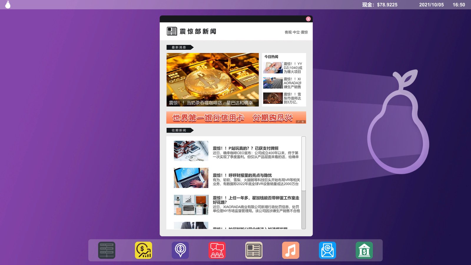 震惊部财经新闻:玩家可以在这里了解到市场的最新信息,通过合理的分析判断进行不同的投资策略,同时也可以买通主编发布软文,控制加密货币的价格走势。
