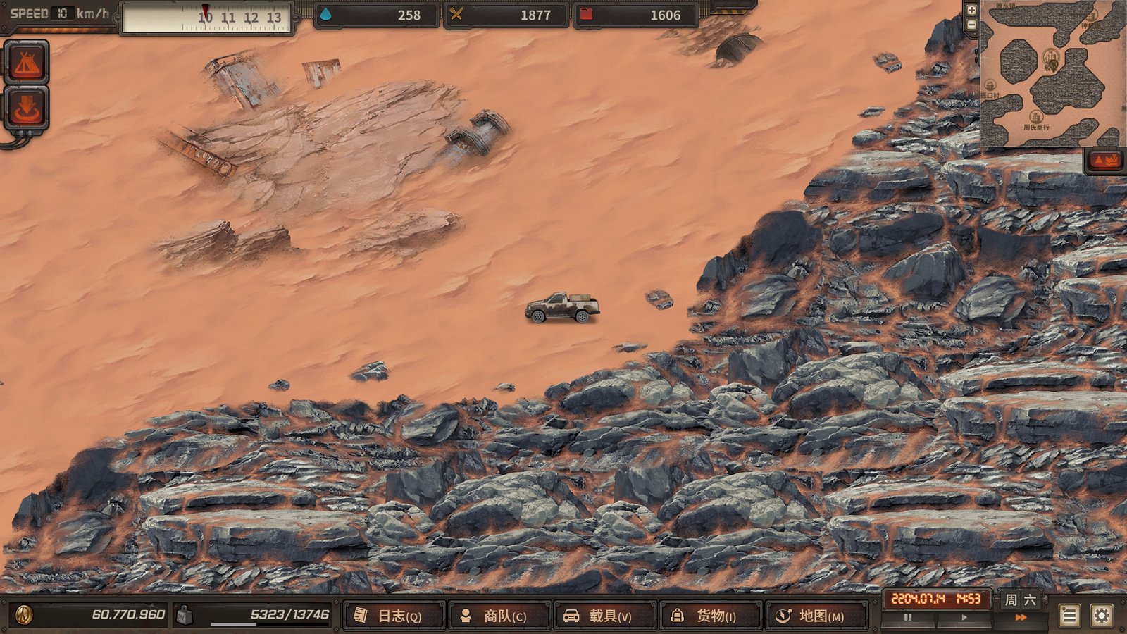 徒步或登上你的载具自由地探索这片残余着辐射的末世废土,直面来自各种变异怪物、土匪强盗、突发事件以及恶劣自然环境的挑战。然而玩家还面临着来自生存的挑战,在地图行进的过程中,饮水、食物、燃油的匮乏都有可能导致你的商队覆灭。